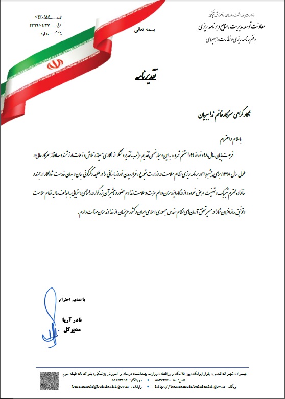 تقدیر مدیرکل دفتر برنامه ریزی ونظارت راهبردی وزارت بهداشت درمان وآموزش پزشکی از خانم ندا ببریان