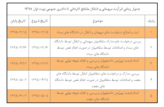 با توجه به فعال شدن سامانه مهمانی و انتقالی وزارت بهداشت از تاریخ 98/2/15کلیه درخواست ها باید در سامانه مهمانی و انتقالی ثبت گردد. تاریخ های مهم این فرآیند در جدول زیر قابل مشاهده است.