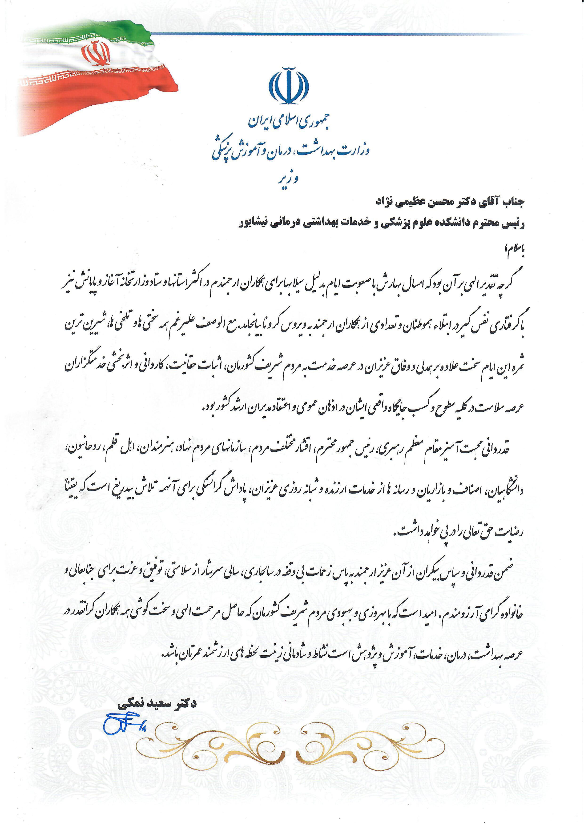 پیام قدردانی مقام عالی وزارت از رئیس دانشکده علوم پزشکی نیشابور