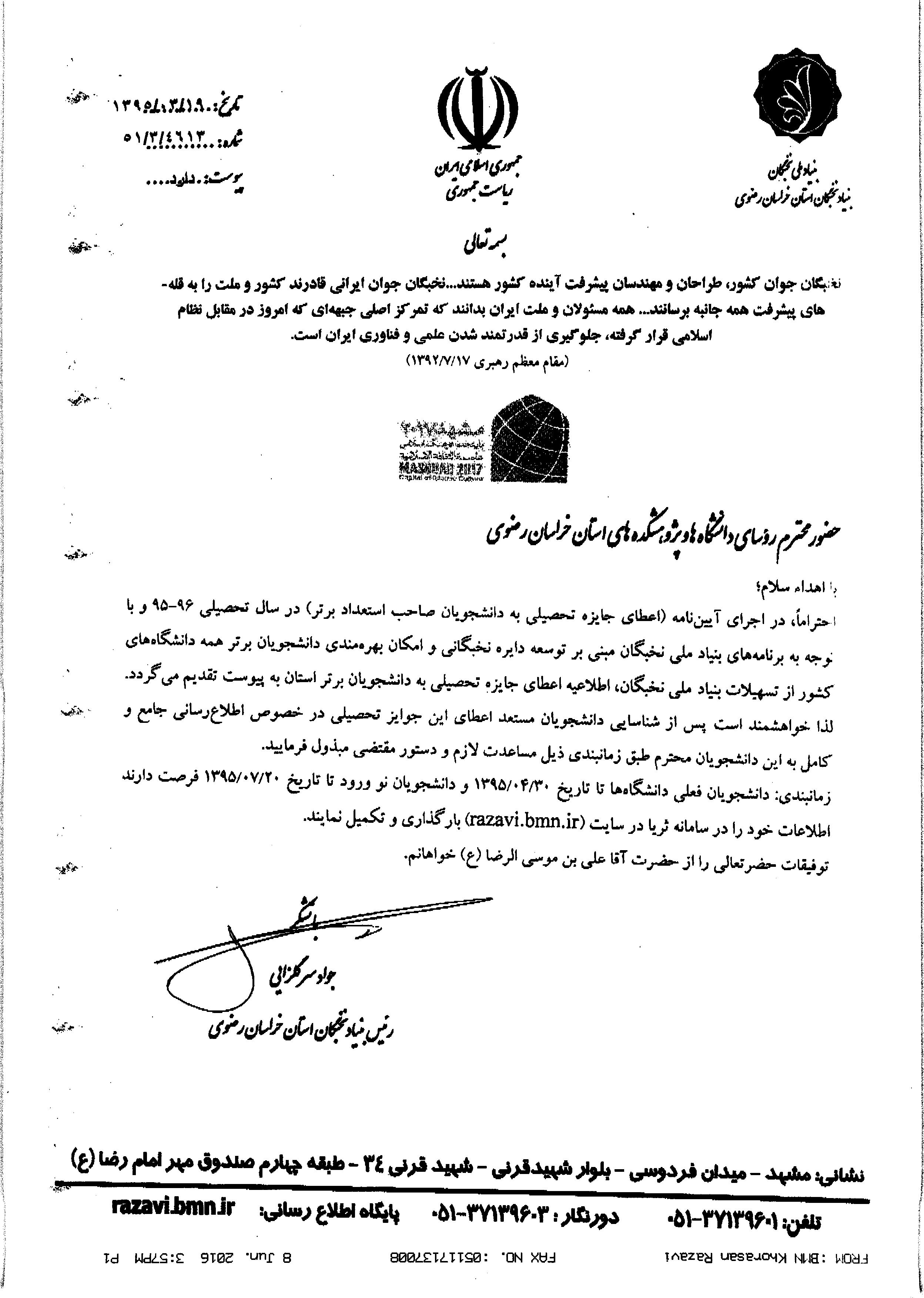 پیرو اطلاعیه صادر شده از بنیاد ملی نخبگان استان خراسان رضوی، مقرر گردیده به دانشجویان برتر استان از طرف بنیاد جایزه ویژه ای تعلق گیرد. دانشجویان محترم حائز شرایط جهت اطلاع از شرایط فایل پیوست را ملاحظه نمایند.