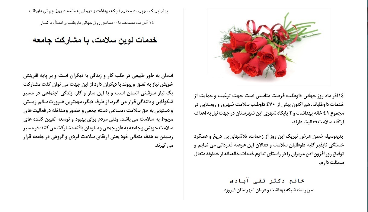 پیام تبریک سرپرست  شبکه بهداشت و درمان  فیروزه به مناسبت روز جهانی داوطلب